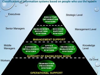This document discusses various types of information systems. It begins by defining data and information, with data being raw facts and information being organized data that provides additional value. It then covers transaction processing systems, management information systems, executive information systems, and the differences between TPS and MIS. The document also discusses information system infrastructure and architecture, including client/server, enterprise-wide, and internet-based architectures. It provides characteristics and examples of different information systems.