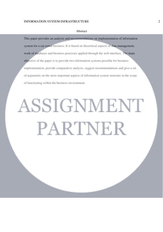 This document analyzes and recommends information system implementations for a car rental business, focusing on data management and business processes through web interfaces. It provides two potential information system models, a comparative analysis of their advantages and disadvantages, and emphasizes the importance of security and usability in system design. The paper concludes that while the first model prioritizes security, the second model is user-friendly but requires more investment and has potential security risks.