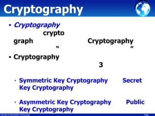 This document discusses cryptography techniques including symmetric key cryptography, stream ciphers, the one-time pad cipher, RC4 stream cipher, and asymmetric key cryptography. Symmetric key cryptography uses the same key for encryption and decryption, while asymmetric key cryptography uses public and private key pairs. Specific techniques covered include DES, AES, RC4 stream cipher, one-time pad, and the RSA algorithm for asymmetric encryption.