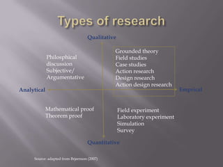 Action research is an iterative process that aims to solve practical problems while expanding scientific knowledge. It involves researchers and practitioners collaborating through problem identification, data collection, action implementation, evaluation, and reflection. The goal is to both address organizational issues and contribute to academic theory. Action research uses qualitative methods and embraces subjectivity to gain an in-depth understanding of real-world problems in their social context. Researchers play a facilitative role to ensure the process is collaborative, reflective, and aims to empower participants through emancipatory knowledge.