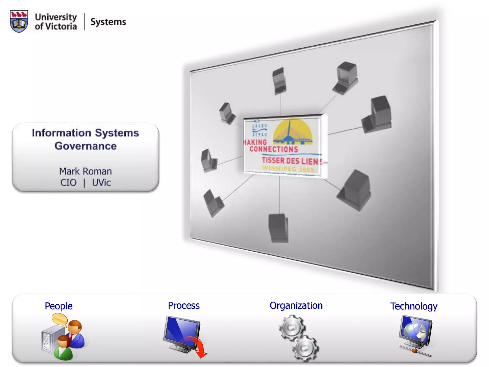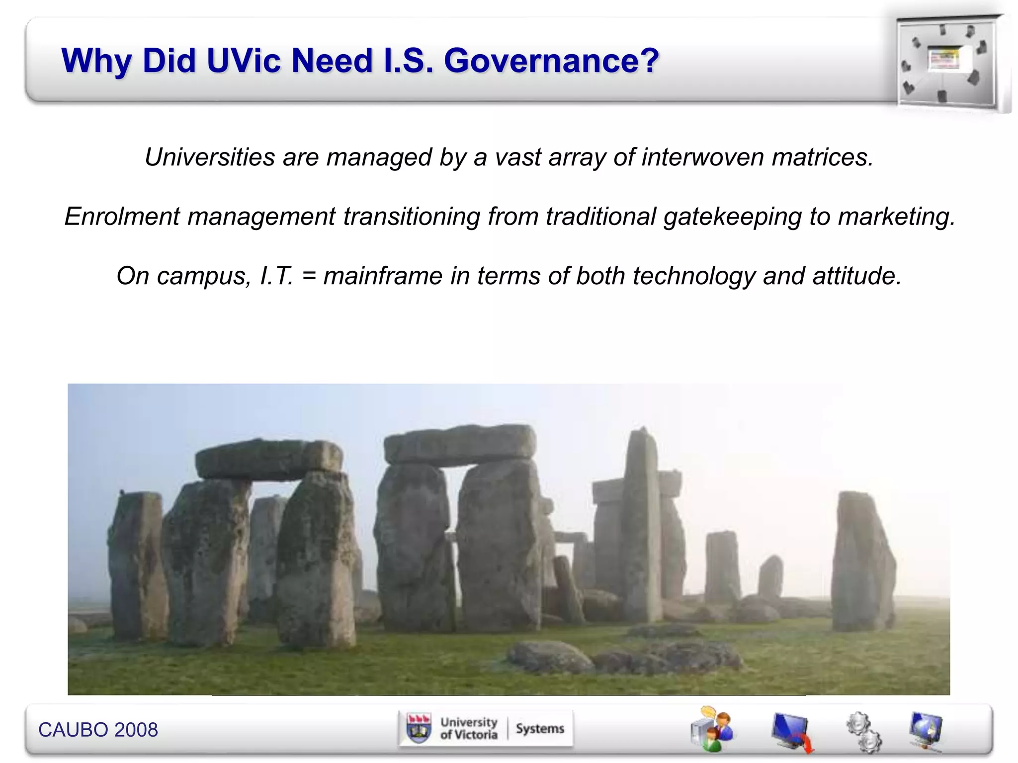 The document discusses the need for information systems (I.S.) governance at the University of Victoria (UVic). It describes how UVic previously had an outdated "mainframe" approach to I.T. and how enrolment was transitioning from traditional to marketing-based. It then outlines UVic's I.S. governance framework, principles, structure, and mandates to formally engage stakeholders in I.S. decision making and ensure strategic alignment of I.S. investments with university priorities.