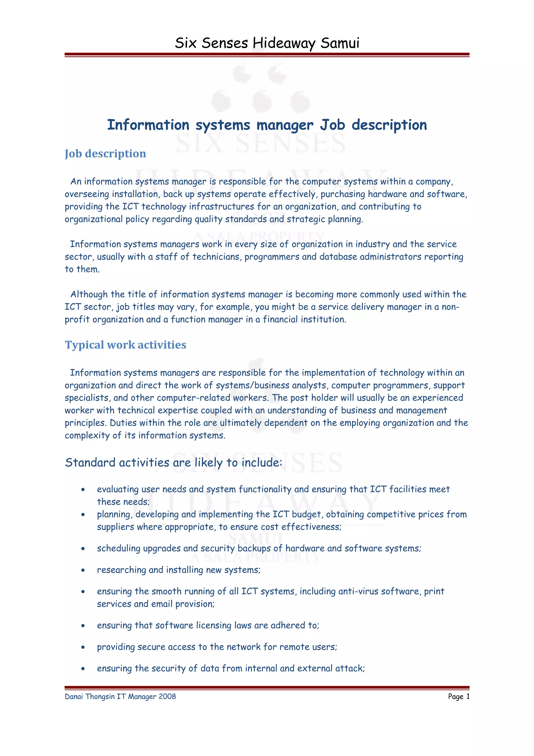 An information systems manager is responsible for overseeing a company's computer systems, including installation, backups, purchasing hardware and software, and ensuring technology infrastructure meets user needs. They work in organizations of all sizes across industries, managing technicians, programmers, and administrators. While job titles may vary, core responsibilities include implementing technology, managing budgets, researching new systems, providing user support, and ensuring security, compliance, and system uptime. The role requires technical expertise as well as an understanding of business and management.