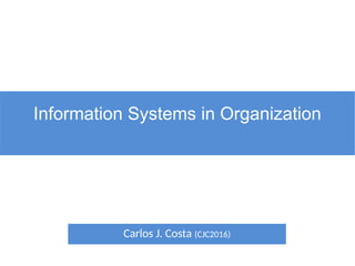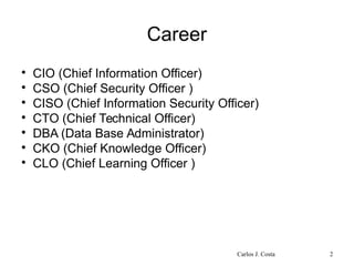 The document discusses various roles in information systems organizations. It lists common career roles such as Chief Information Officer (CIO), Chief Security Officer (CSO), Chief Information Security Officer (CISO), Chief Technical Officer (CTO), and Database Administrator (DBA). It also provides definitions and descriptions of IT consulting, IT outsourcing, and IT temporary work. Videos and external links are referenced for additional information on some of the roles.