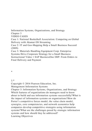The document discusses the interplay between information systems and organizations, detailing how these systems impact organizational structure, culture, and strategy. It covers various models, such as Porter's competitive forces model, and emphasizes the importance of understanding organizational features when implementing information systems. Furthermore, it explores organizational behaviors, decision-making processes, and how changes in technology influence firm dynamics.