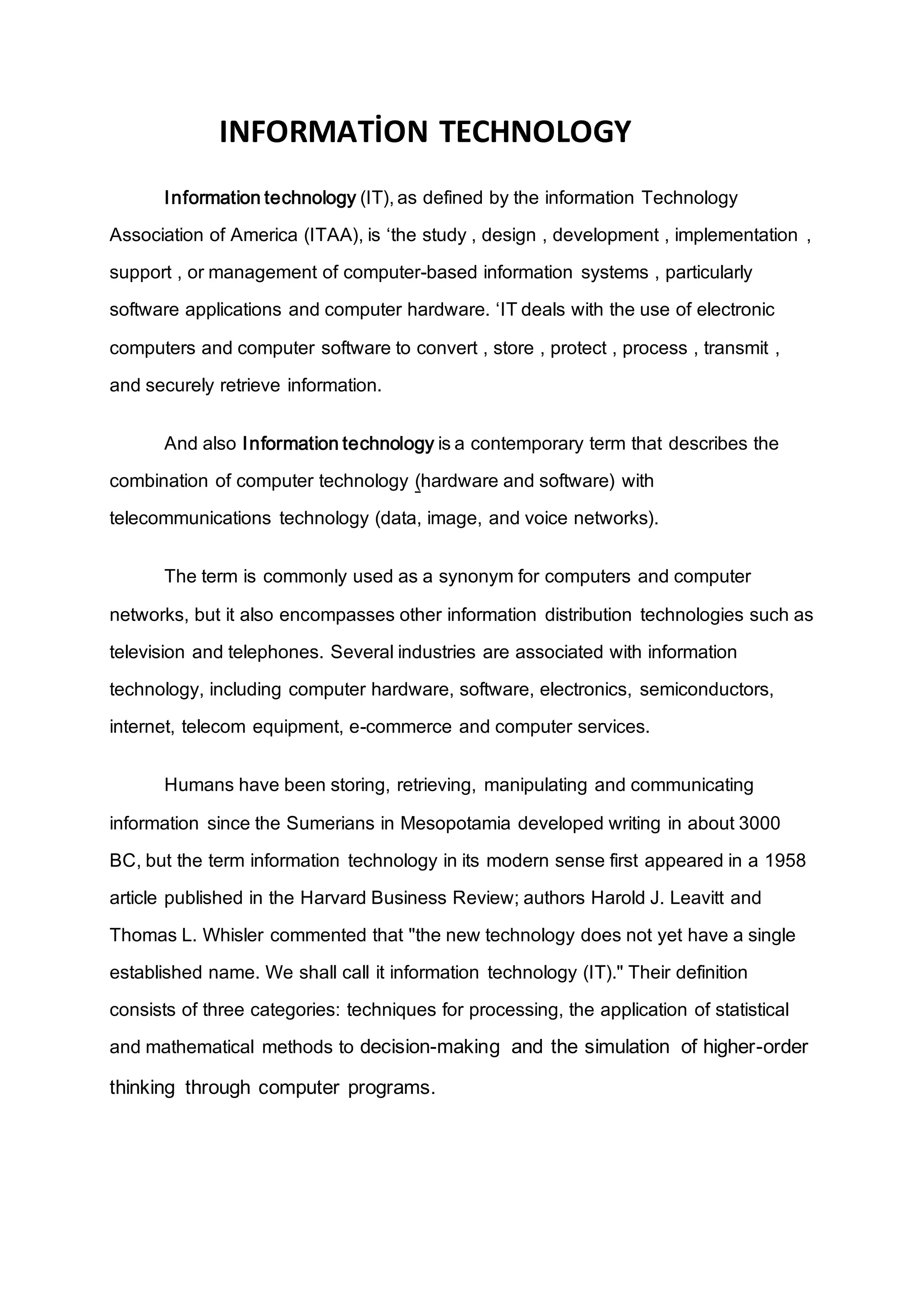 Information technology (IT) involves the use of computers and telecommunications to store, retrieve, transmit, and protect information. It is commonly used as a synonym for computers and computer networks. Key aspects of IT include computer hardware, software, electronics, and computer services. While humans have stored and communicated information for thousands of years, the term "information technology" emerged in the 1950s with the development of computers and digital networks. IT has now become essential in many industries and aspects of modern life.