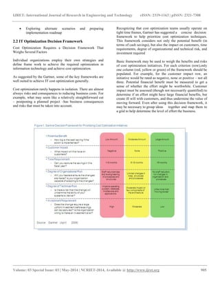 The document discusses strategies for information technology (IT) cost optimization in a competitive business environment, emphasizing the need for a structured approach to achieve sustainable cost reductions while maintaining performance. Key focuses include transparency, agility, accountability, simplification, and discipline in IT management, alongside the importance of collaboration with business leadership. Recommendations are provided for prioritizing cost optimization efforts and engaging stakeholders to ensure successful implementation.