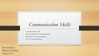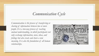 The document outlines the communication process, emphasizing its role in sharing information and fostering human relationships through various methods such as verbal, non-verbal, and visual communication. It describes barriers to effective communication, perspectives that influence understanding, and highlights the 7 C's of communication which serve as a checklist for improving communication skills. Each of these aspects is essential for achieving mutual understanding and enhancing interactions in personal and professional settings.