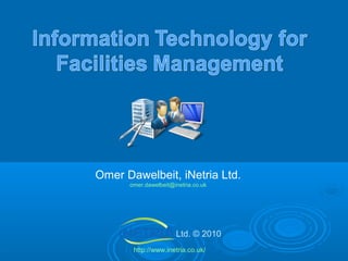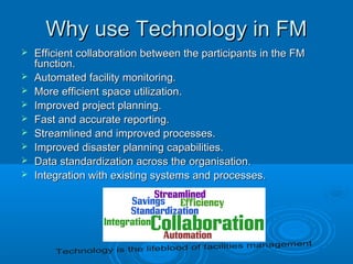The document discusses the importance of technology in facilities management (FM), emphasizing efficient collaboration, automated monitoring, and improved communication among participants. It highlights challenges in integrating various FM platforms and the evolution of web applications, cloud computing, and the emerging semantic web. The document also touches upon the future of collaborative applications and the potential of the semantic web in enhancing data classification and user engagement.