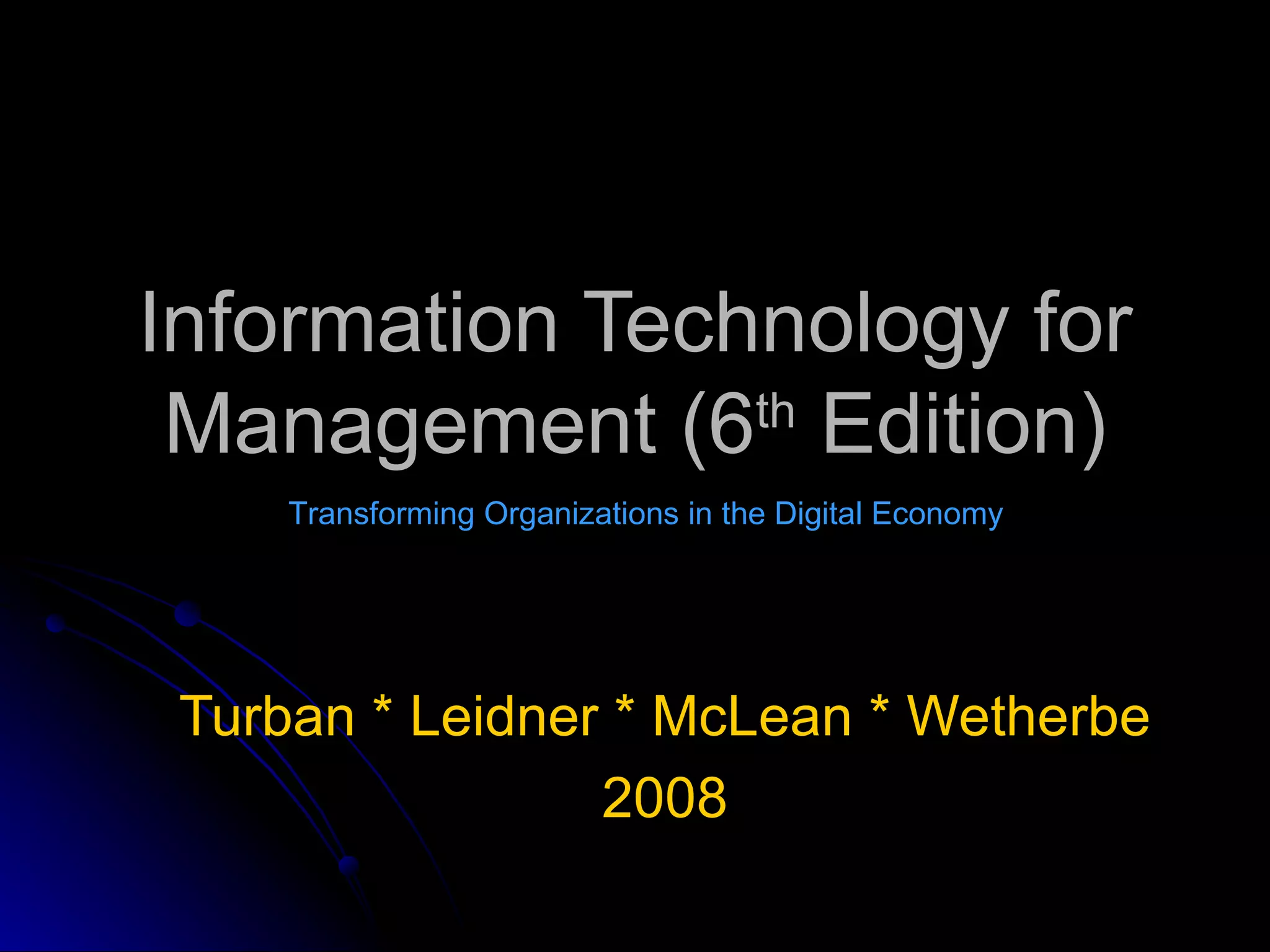 The document summarizes the organization and contents of the 6th edition of the textbook "Information Technology for Management" by Turban, Leidner, McLean, and Wetherbe from 2008. The textbook is divided into 6 parts covering IT in organizations, infrastructure, the web revolution, organizational applications, managerial systems, and implementing/managing IT. Each part contains chapters that provide overviews of key topics, cases, and resources to support student learning.