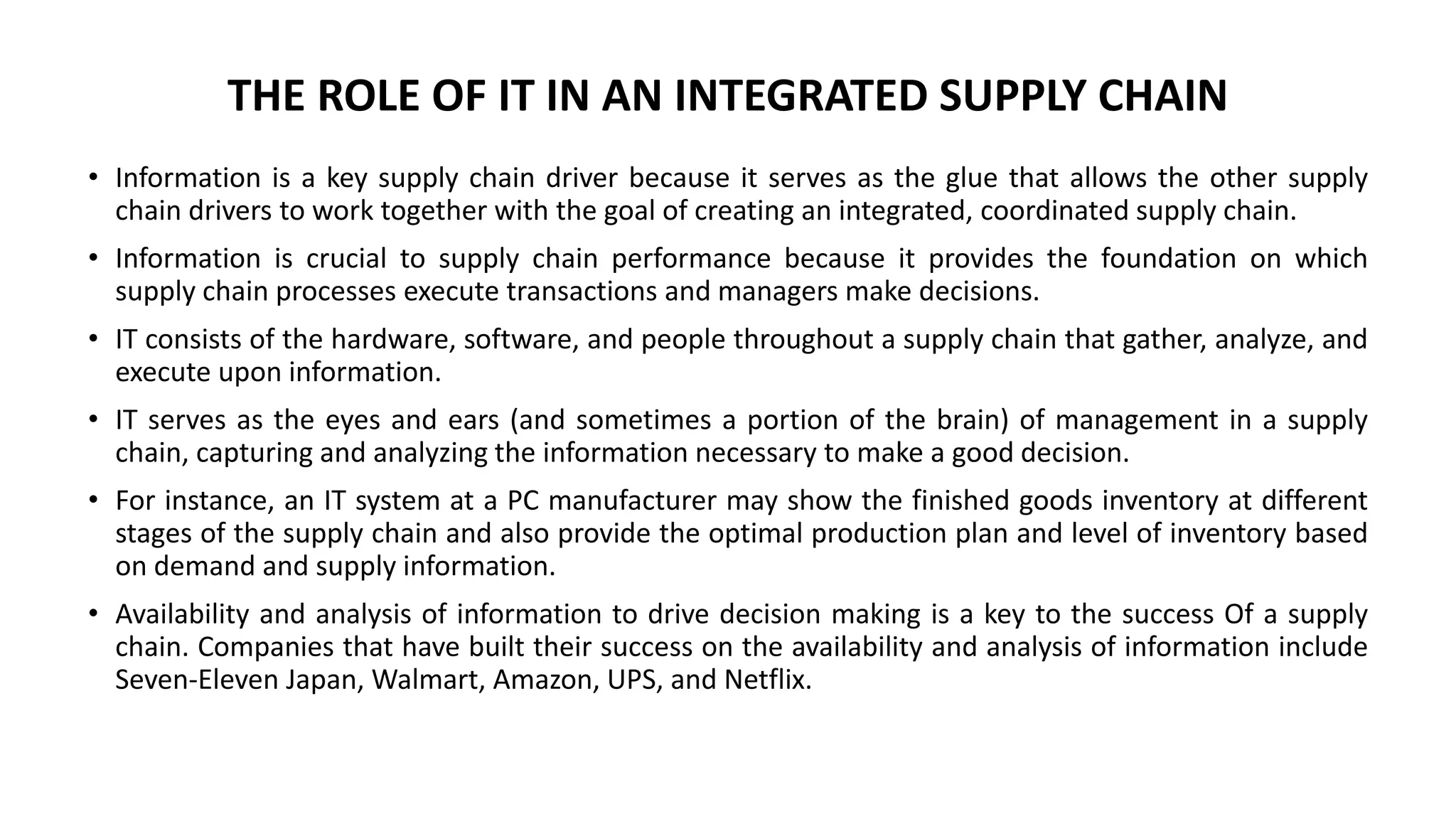 The document discusses the role of information technology (IT) in supply chain management. It makes several key points:
