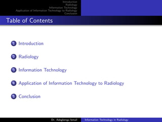 This document discusses the application of information technology to radiology. It defines radiology and information technology, and describes how various information technologies such as PACS, RIS, teleradiology, and computer-aided diagnosis have automated processes and improved access to radiological images and data. The document also provides examples of how computed radiography digitizes the film development process in radiography. Overall, the document outlines how information technology continues to add value to the field of radiology.