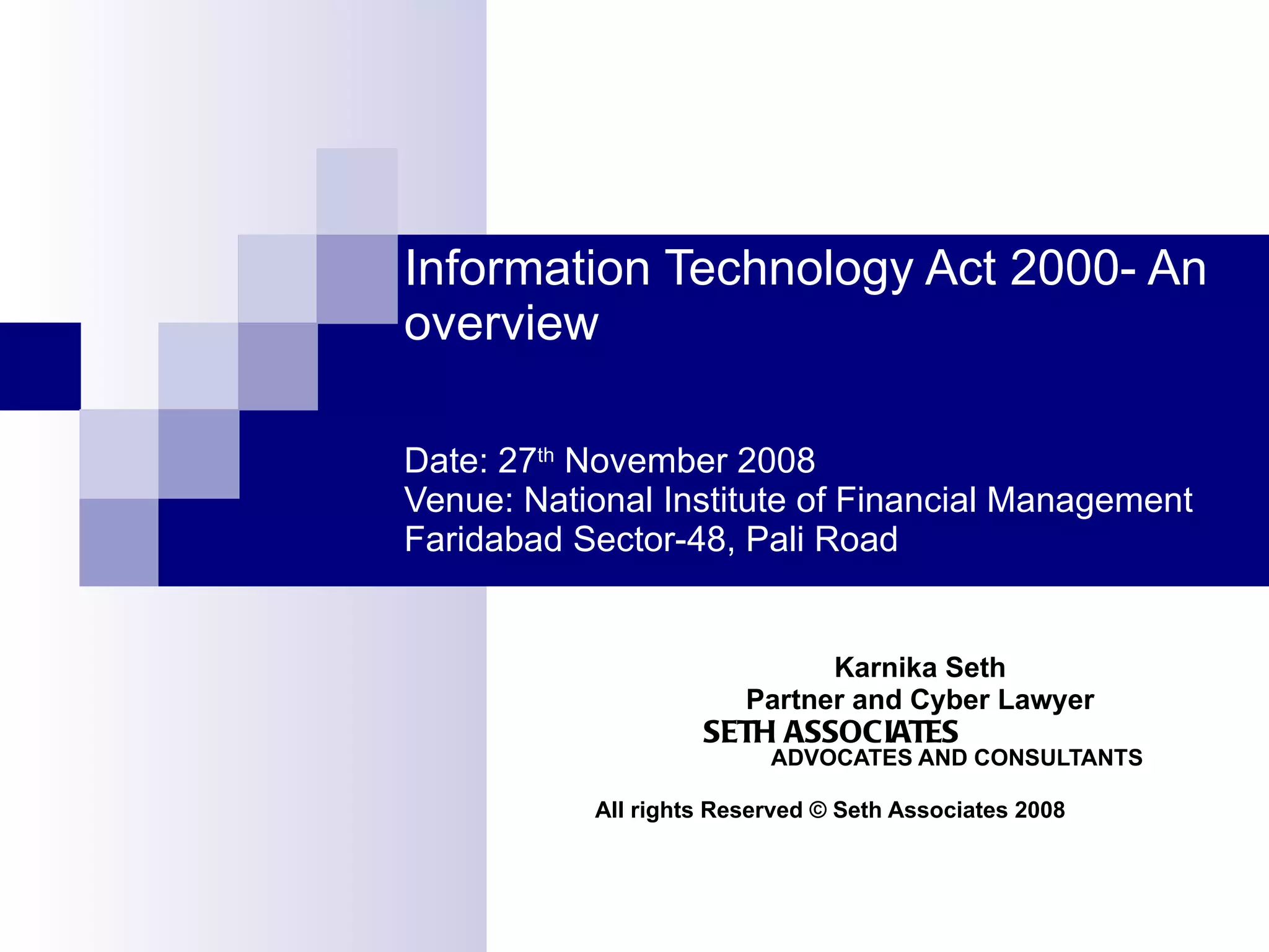 The document provides an overview of the Information Technology Act 2000 of India. It discusses key objectives of the act such as providing legal recognition to electronic transactions and records. It also defines important terms used in the act like computer, electronic record, digital signature. The roles of regulatory authorities like the Controller of Certifying Authorities in licensing and auditing Certifying Authorities are summarized. Provisions around digital signatures, electronic records and their admissibility as evidence are also briefly outlined.