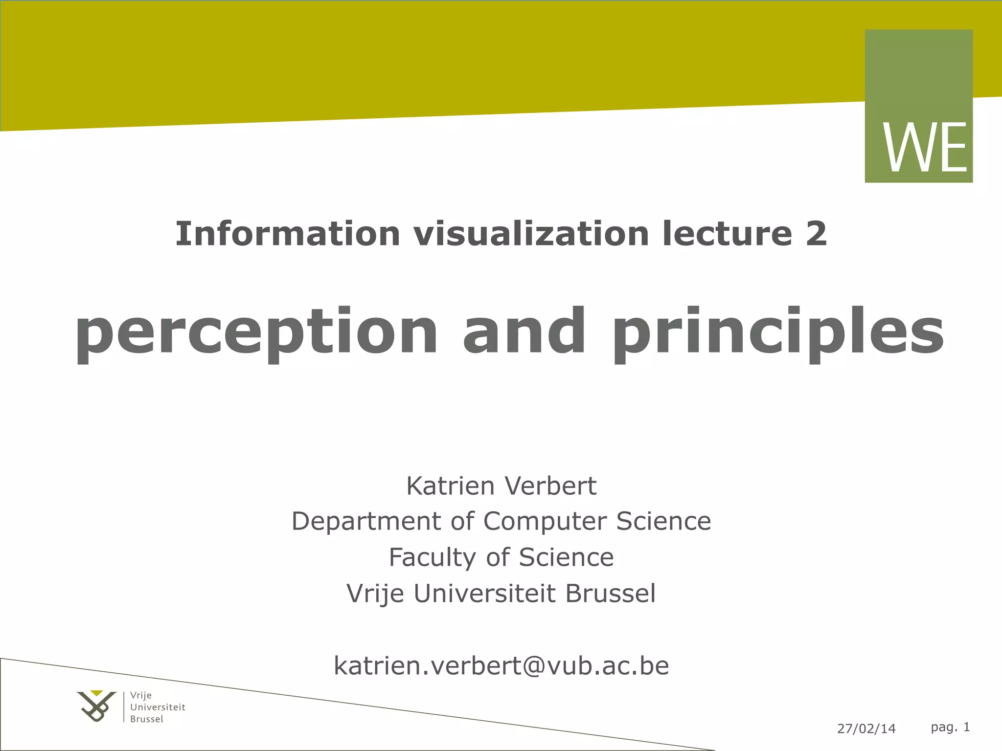 This document contains lecture slides about information visualization and perception principles from a lecture at Vrije Universiteit Brussel. It discusses topics like how the brain perceives visuals, pre-attentive processing techniques to make things "pop out", encoding methods for representing quantitative data, Gestalt grouping principles, and the use of color in visualization. The slides include examples and illustrations related to these concepts.