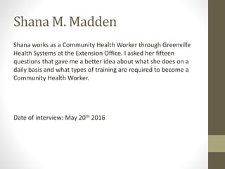 Shana Madden works as a Community Health Worker through Greenville Health Systems. She interviewed Barron Hicklin and provided insights into her daily responsibilities and qualifications needed for the role. Some key points include: