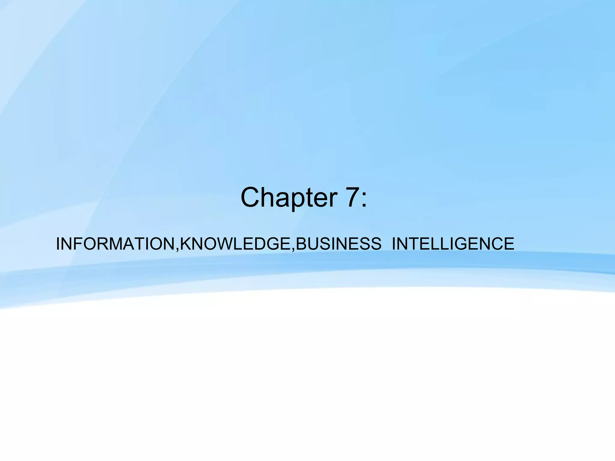 This document discusses concepts related to information, knowledge, and business intelligence. It defines data, information, and knowledge; information is processed data that is meaningful, while knowledge represents analyzed information. Business intelligence refers to gathering, processing, and maintaining live, relevant data and information to support timely decision-making. The document also covers information presentation, quality, classification, value, and knowledge management.