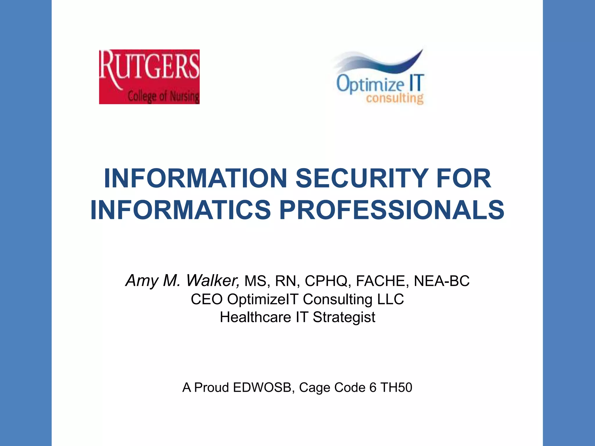 This document discusses information security for informatics professionals. It begins with an introduction of the speaker, Amy Walker, which details her experience in healthcare, informatics, and security. The presentation will cover IT security pillars, constructing policies and procedures, security standards and risk assessment strategies, system architecture and design, and an overview of security issues and solutions. Examples of data breaches and related fines are provided to illustrate security risks faced by healthcare organizations. Frameworks and best practices for security are also outlined to help attendees strengthen their organization's security posture.