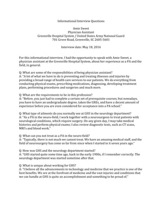 Amie Sweet is a physician assistant at Greenville Hospital System who works in the neurology department. She discussed her responsibilities, which include conducting exams, prescribing medications, diagnosing conditions, and developing treatment plans. She noted the requirements to become a PA have increased and now include an undergraduate degree, GRE scores, and clinical experience. As a neurology PA, she works with neurosurgeons to treat neurological conditions requiring surgery by taking medical histories, performing exams, and reviewing diagnostic tests. The interview discussed her typical work schedule, benefits of working at a large hospital like GHS, and her advice for gaining acceptance to PA school, which is to gain clinical experience.