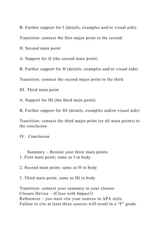 This document outlines the structure for an informative presentation, including an introduction with an attention getter and establishing credibility, a body with three main points and supporting evidence, and a conclusion summarizing the three points. Transitions are used to connect each section. References from credible sources are required to be cited in APA style.