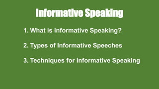 Informative speaking aims to teach or inform the audience. There are five types of informative speeches: about an object, individual/group, event, process, or idea. Effective techniques include definition, explanation, description, demonstration, and narrative.