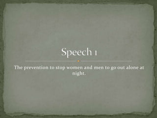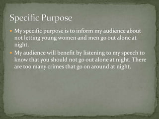 The document provides advice to inform an audience about not letting young women and men go out alone at night due to safety risks. It outlines crimes like rape that often occur because people don't pay attention or are easy targets. The document recommends ways to stay safe like being aware of one's surroundings, telling friends/family if anything happens, carrying weapons like pepper spray, and traveling with friends. It analyzes audience responses about safety experiences and emphasizes the importance of not going out alone.