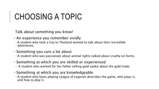 This document provides guidance for choosing an informative speech topic and organizing the speech. For the topic, it recommends speaking about a personal experience, something you are passionate about, skilled in, or knowledgeable in. It then lists various ways to organize the speech, such as using a past-present-future, time, problem-solution, location, cause-effect, related subtopics, or advantage-disadvantage structure. Examples are provided for each organizational structure.
