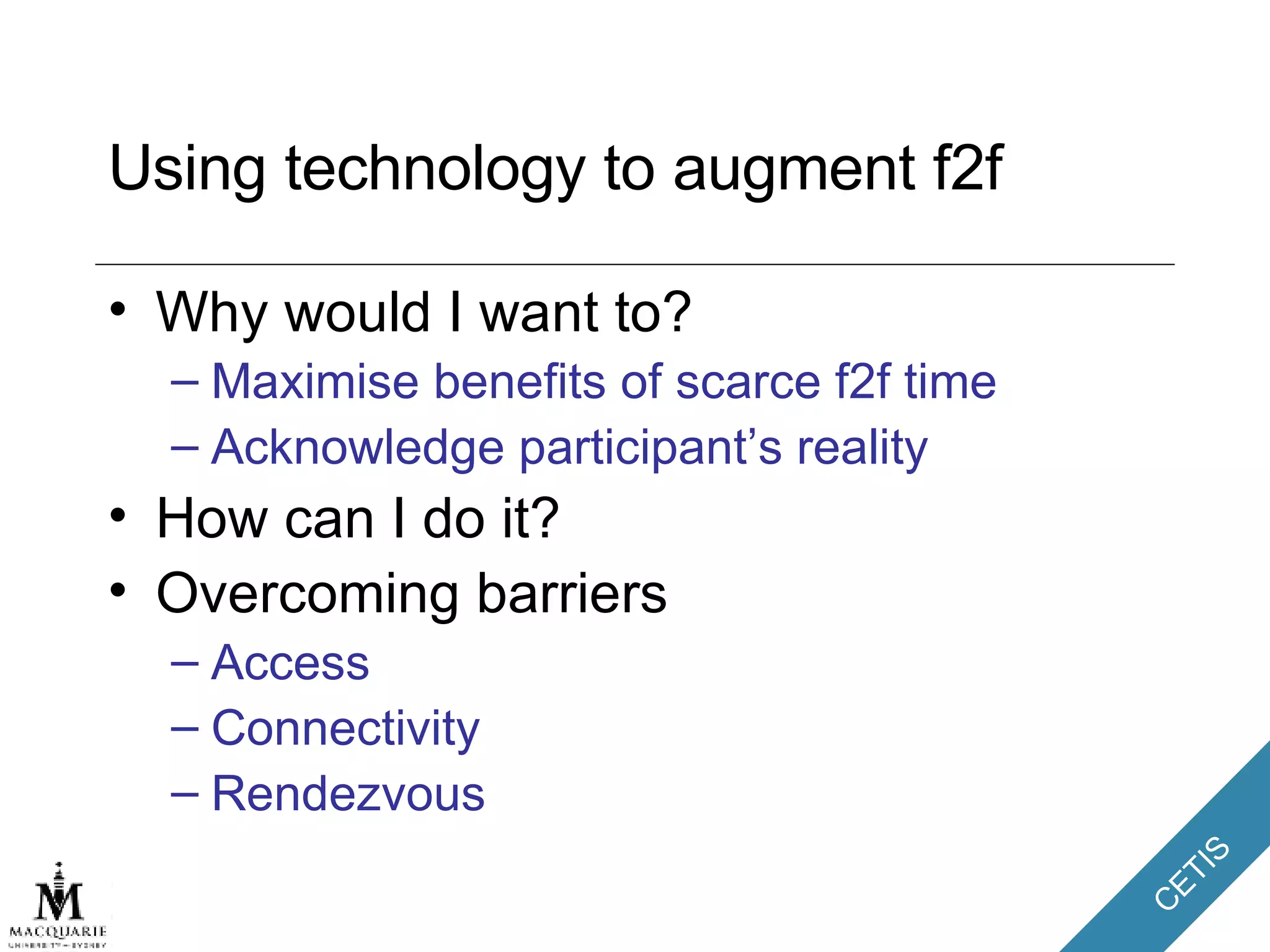 The document outlines strategies for enhancing face-to-face sessions using technology, emphasizing backchanneling, collaborative tools, and mobile solutions. It presents various approaches including in-session chat, collaborative notemaking, and mobile social software to enrich participant engagement and post-event reflections. Additionally, it highlights the use of QR codes for link sharing, mobile recording, and social networking to facilitate ongoing interaction and resource sharing.