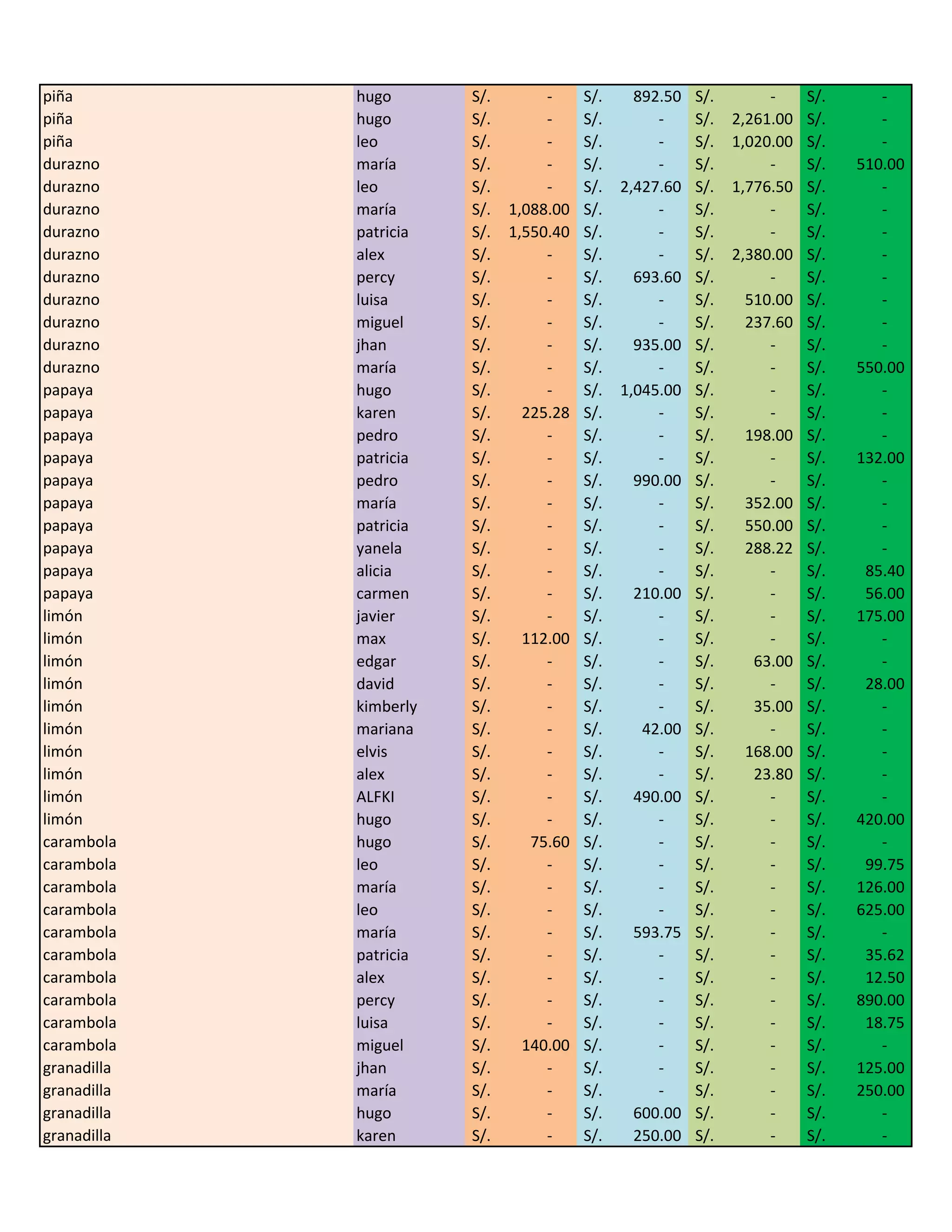 The document contains sales data over four periods (trimesters) for various customers and products including oranges, mangoes, apples, bananas, pineapples and other fruits. It lists the sales amount in Peruvian Soles (S/.) for each customer-product combination for each trimester. Some customers have sales in some trimesters but not others. There is sales data for over 30 different fruits.