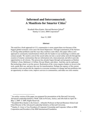 The paper discusses the urgent need to transform U.S. urban communities into smarter cities using technology to enhance connectivity and inform citizens amidst the current economic crisis. It highlights the historical challenges faced by urban areas and emphasizes creating a social safety network to improve services, foster collaboration, and ensure opportunities for all citizens. The authors propose that leadership and integrated approaches, utilizing technology alongside community involvement, are essential for overcoming barriers and achieving sustainable urban development.