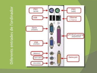 2.5. Els perifèricsd’entrada de dades S’utilitzen per a introduir informació a l’ordinador. Tot i que hi ha molts de tipus de perifèrics, n’hi destacam: El teclat: ens permet l’entrada d’informació, destacant l’escriptura i els controls funcionals. El ratolí: ens permet moure el cursor i realitzar tot tipus de tasques. Ambdós tenen entrades per ports PS/2 tot i que actualment s’utilitza l’USB.