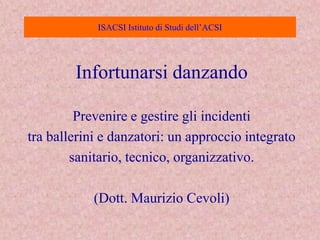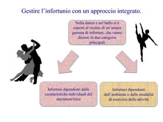 Il documento discute la prevenzione e la gestione degli infortuni tra ballerini utilizzando un approccio integrato che considera fattori individuali, ambientali e organizzativi. Viene sottolineata l'importanza di schede cliniche complete, personalizzazione degli allenamenti e intervento tempestivo in caso di infortunio. Viene anche evidenziata la necessità di una collaborazione attiva tra danzatori, allenatori e professionisti medici per migliorare la gestione del rischio.