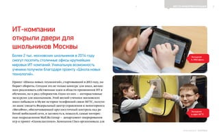 Документ описывает проекты, направленные на интеграцию информационных технологий в образовательный процесс, включая экскурсии для школьников в IT-компании и внедрение виртуальных учебных сред. Он подчеркивает преимущества компьютерных технологий и программного обеспечения для обучения и взаимодействия между учителями и учениками. Также упоминается использование компьютерных игр как средства повышения мотивации и интереса к учебе.