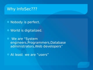 This document discusses various information security topics such as sniffing, spoofing, phishing, denial of service attacks, and password attacks. Sniffing involves intercepting network traffic, while spoofing involves falsifying data to gain an illegitimate advantage. Phishing attempts to acquire sensitive information by masquerading as a trusted entity. Denial of service attacks aim to make computer resources unavailable. Password attacks include brute force guessing or using dictionaries to discover passwords. The document provides examples of these security risks and techniques used in attacks.