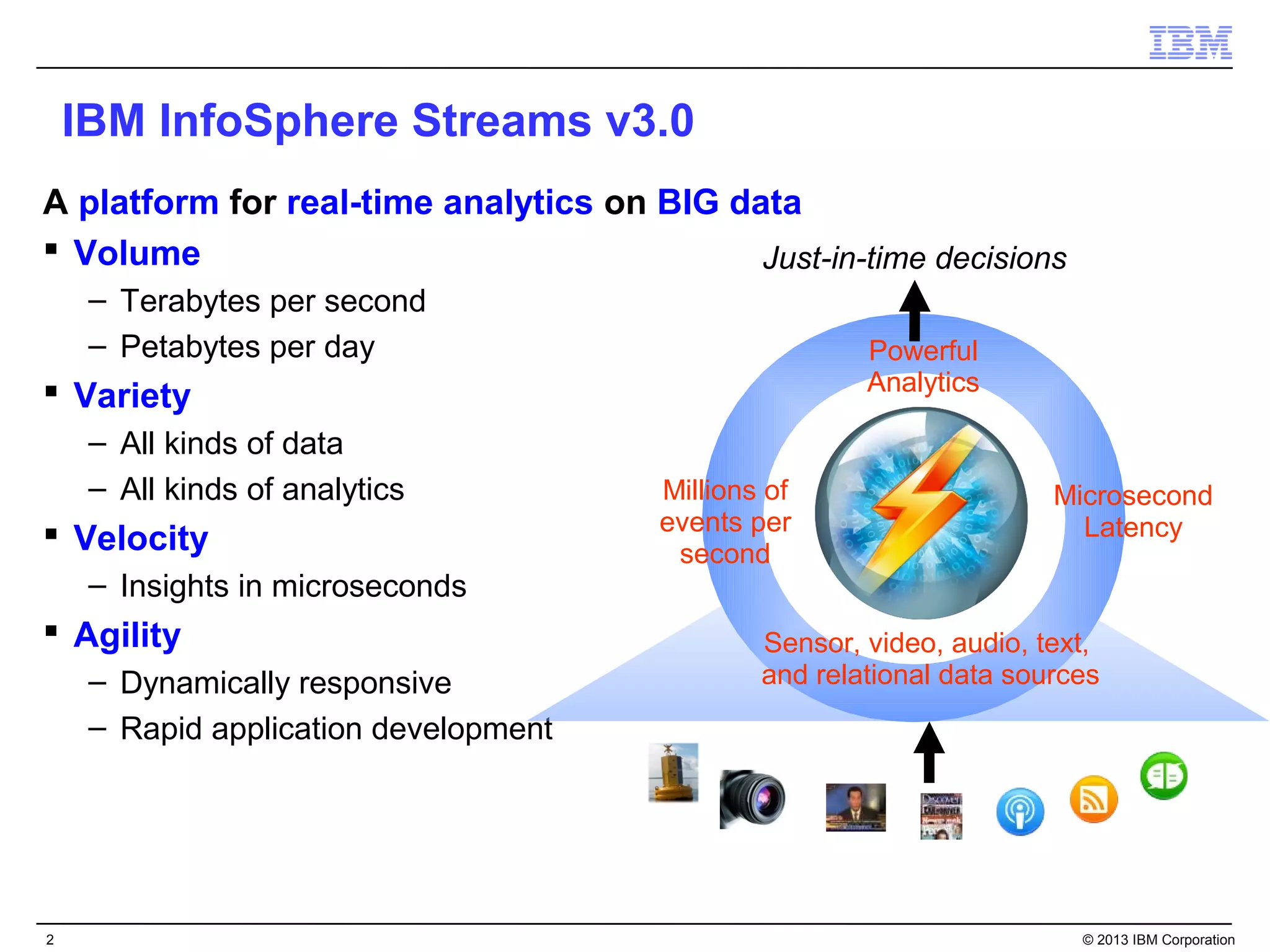 This document provides an overview of IBM InfoSphere Streams, a platform for real-time analytics on big data. It discusses key features such as handling high data volumes and varieties at tremendous velocities, and the ability to perform analytics with microsecond latency. It also summarizes the types of problems that can be solved using InfoSphere Streams, including applications that require real-time processing, filtering and analysis of streaming data from various sources.