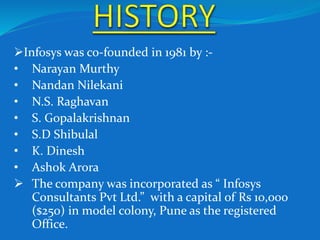 Infosys was co-founded in 1981 by seven individuals with a capital of Rs. 10,000. It was incorporated as Infosys Consultants Pvt Ltd and was later renamed to Infosys Technologies Ltd. Infosys provides business consulting, IT services and products to clients worldwide and has established partnerships with leading technology companies like IBM, Microsoft and HP. It has acquired other companies like Lodestone to strengthen its management consulting capabilities. Infosys has experienced rapid growth over the years and achieved several milestones, becoming a publicly traded company on the Indian stock exchanges in 1993.