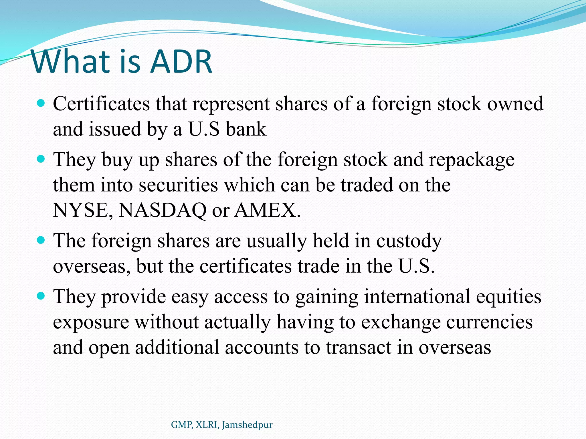 American Depository Receipts (ADRs) represent shares of a foreign company that trade on an American stock exchange. There are three levels of ADRs with different regulatory requirements. Level 1 ADRs trade over-the-counter with the least regulation, while Level 3 ADRs have the most rigorous regulations, potentially including raising capital from US investors. ADRs make it possible for US investors to gain international stock exposure without having to deal with foreign exchange or open overseas accounts. Global Depository Receipts (GDRs) operate similarly but trade on exchanges outside the US, while Indian Depository Receipts (IDRs) allow foreign companies to issue shares to Indian investors.
