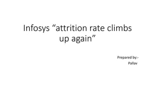 Infosys' attrition rate has climbed again according to a report. Attrition refers to the gradual reduction in workforce size due to retirement or resignation. High attrition rates can negatively impact companies through loss of productivity, increased costs of recruitment and training, and loss of revenue. In 2006, Infosys' attrition rate was 12.9% compared to industry averages of 22-24%. To address attrition, Infosys has implemented measures like compensation increases, employee stock purchase plans, improved work-life balance policies, and increased learning and development opportunities. However, experts say it can take time for attrition rates to normalize even as Infosys takes corrective actions and new CEO Vishal Sikka's