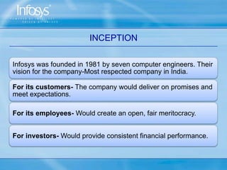 1) Infosys was founded in 1981 and became a publicly traded company in 1993. It has grown to employ over 100,000 employees across 20+ countries.