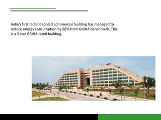 Infosys SDB Block-1 is India's first radiant cooled commercial building, reducing energy consumption by 56% compared to benchmarks. It uses radiant cooling technology where chilled water circulates through pipes in floors, walls or ceilings to absorb heat. The building is also designed with green architecture principles like high insulation, double glazed windows, and restricting the floor plate width to 16m to maximize natural daylight without glare. Smart building systems provide intelligence to operations through energy saving algorithms and ensure employee comfort while identifying potential energy savings.