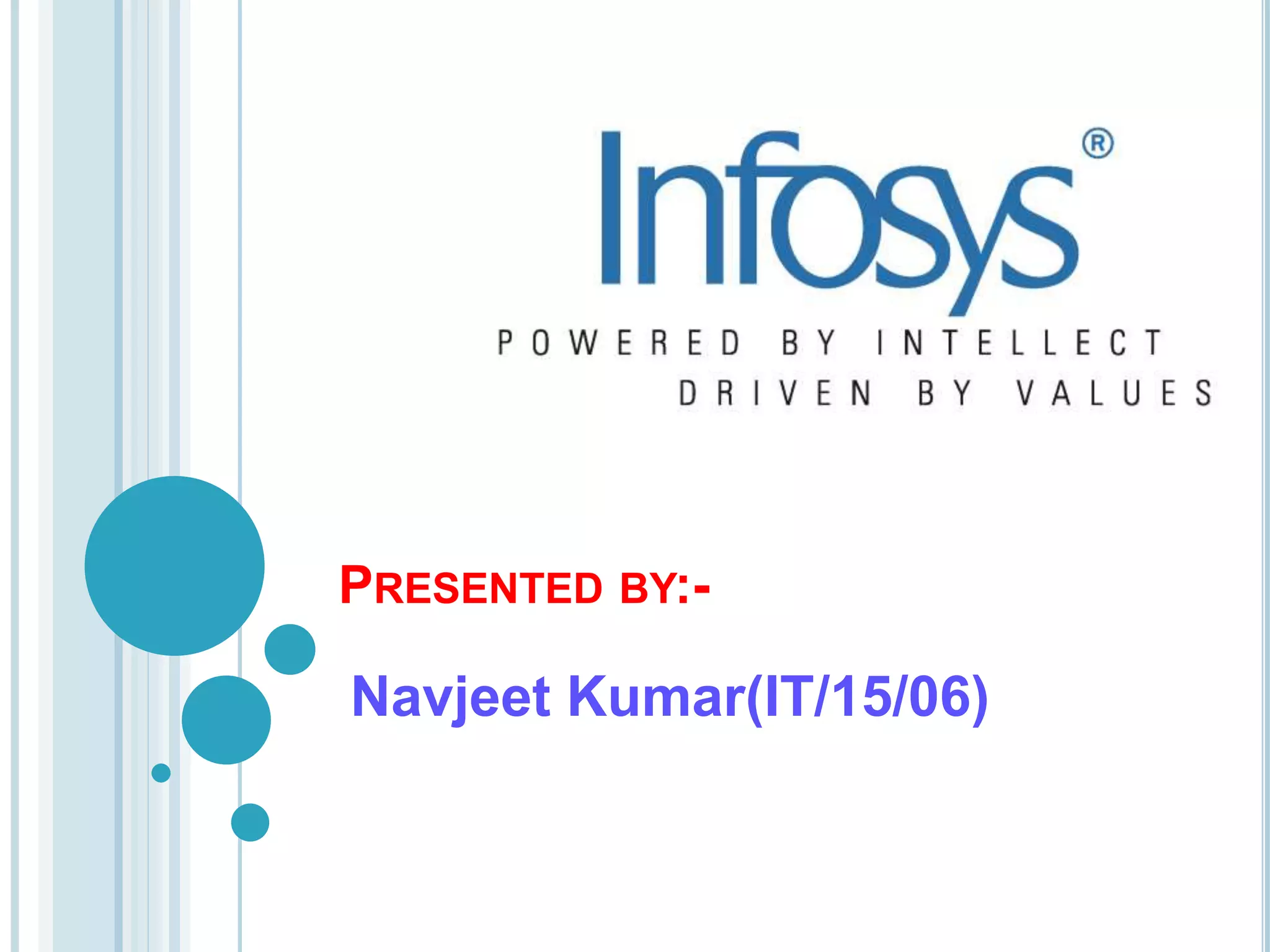 This presentation provides an overview of Infosys, an Indian multinational corporation that provides business consulting, information technology and outsourcing services. It discusses Infosys' vision, mission, history of being founded in 1981, services offered, achievements and certifications, global footprint and locations in India, financial growth and profits, notable clients, products, recruitment process, salary structure, and alliance partners. The presentation was delivered by Navjeet Kumar and acknowledges the support of teachers and classmates.