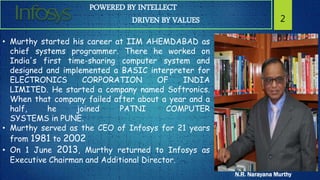 N.R. Narayana Murthy co-founded Infosys in 1981. He served as CEO for 21 years and helped grow Infosys into a major global IT company. Infosys is headquartered in Bengaluru and provides consulting, technology, and outsourcing services to clients around the world. It has over 160,000 employees representing 89 nationalities working from offices in 32 countries.