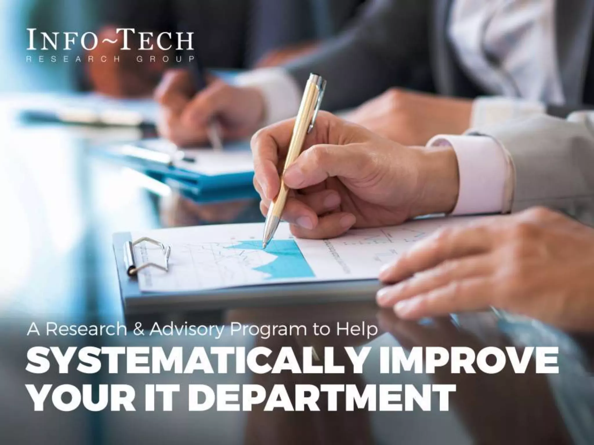 Info-Tech provides resources and methodologies to help IT departments improve performance and deliver business value, offering over 300 project blueprints and 45 comprehensive methodologies. It emphasizes the importance of data-driven strategies and offers training programs to develop IT leadership. The organization aims to enhance core IT processes, enabling members to achieve measurable results and better manage technology projects.