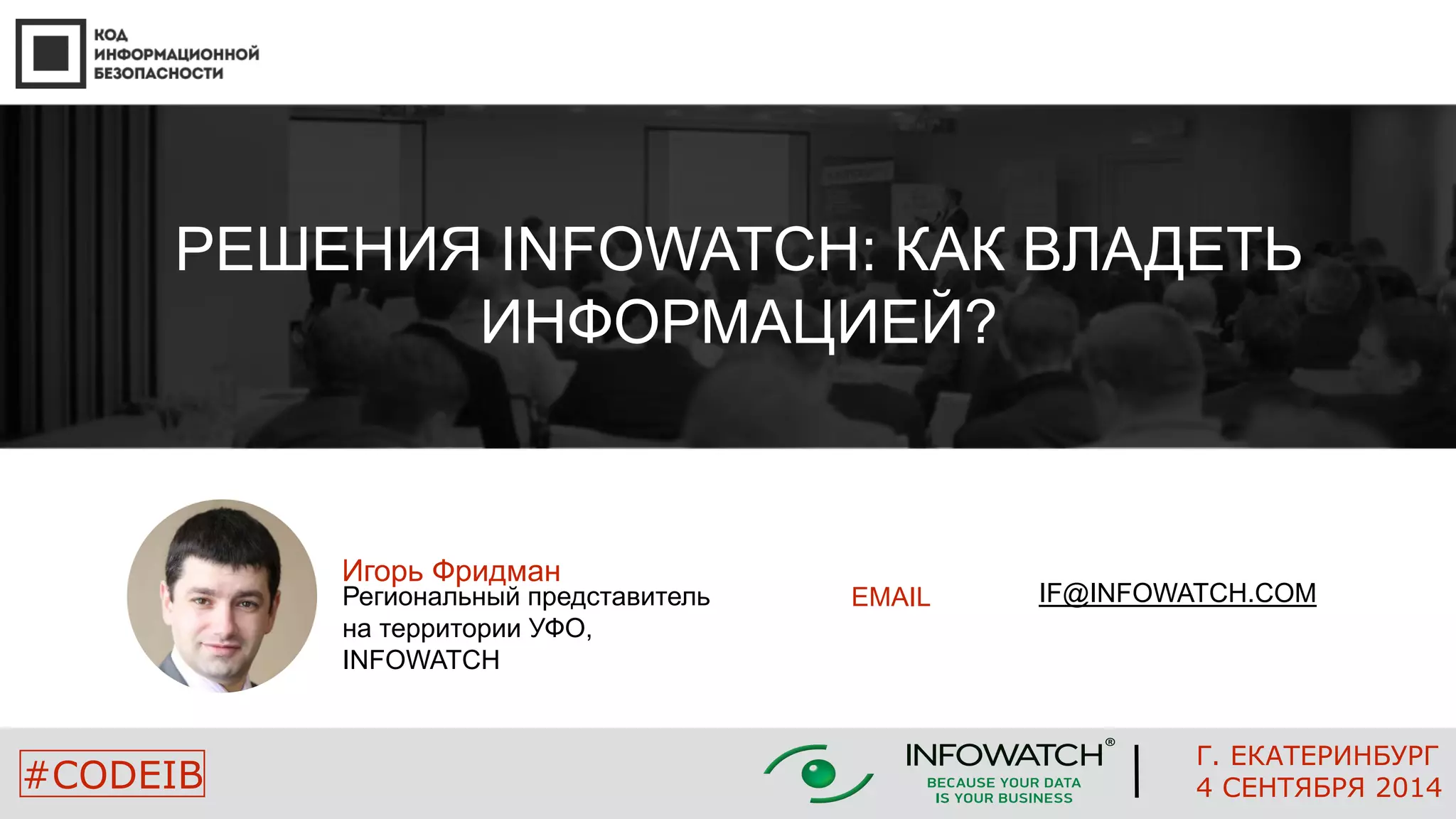 Документ представляет компании Infowatch, специализирующейся на мониторинге, анализе и защите корпоративной информации, основанной в 2003 году. Описываются актуальные угрозы внутренней безопасности, сценарии утечек конфиденциальных данных и последствия утечек для бизнеса. Также рассматриваются решения компании по защите данных и предотвращению утечек информации.