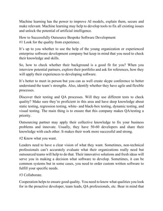 The document discusses the growing demand and financial investment in custom software solutions, highlighting key areas such as ERP, CRM, and AI integration. It emphasizes the importance of outsourcing with a focus on quality, clear requirements, and collaboration to enhance software development processes. Additionally, it outlines various software development models including Waterfall, Agile, Lean, Extreme Programming, and Rapid Application Development, detailing their advantages and disadvantages.