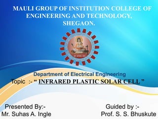 The document discusses infrared plastic solar cells. It describes the construction of these solar cells as a hybrid of tiny nanorods dispersed in an organic polymer or plastic layer only 200 nanometers thick sandwiched between electrodes. The nanorods are made of cadmium selenide and act as wires that absorb light and generate electrons and holes. Infrared plastic solar cells could harness invisible infrared light and be five times more efficient than traditional solar cells. They also work on cloudy days due to their ability to absorb infrared light. While costly now, infrared plastic solar cells show promise as a more compact and flexible alternative energy source.