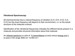 Infrared spectroscopy involves measuring the absorption or emission of electromagnetic radiation by molecules as they undergo transitions between different energy states. Infrared spectroscopy analyzes the infrared region of the electromagnetic spectrum, where molecules absorb radiation based on the vibrational and rotational motions of their bonds. The positions and intensities of absorption bands in an infrared spectrum provide information about the types of bonds in a molecule and can be used to determine its structure.