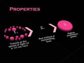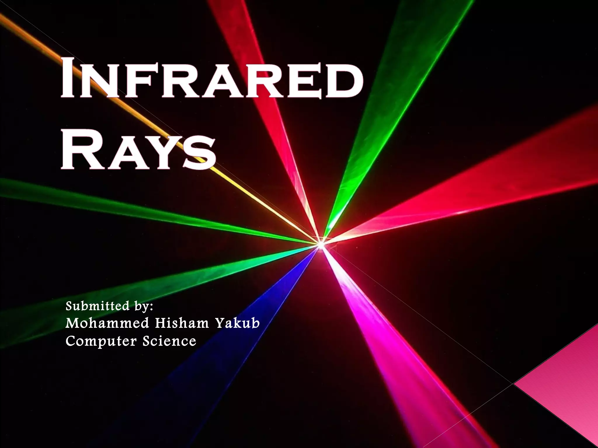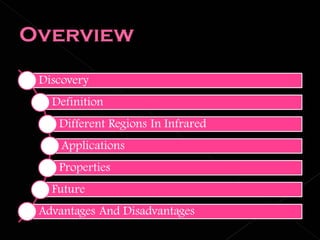 2. Infrared radiation has longer wavelengths than visible light, ranging from 0.7 to 300 micrometers. It was originally called "calorific rays" and is now called infrared.