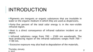 Infrared reflective pigments are stable substances that reflect infrared radiation, helping reduce heat buildup from solar energy. They are synthesized through various methods, including coating and calcination of metal compounds, and are utilized in diverse applications like coatings and automotive products. These pigments contribute to improved durability and lower energy demands, particularly in urban environments.