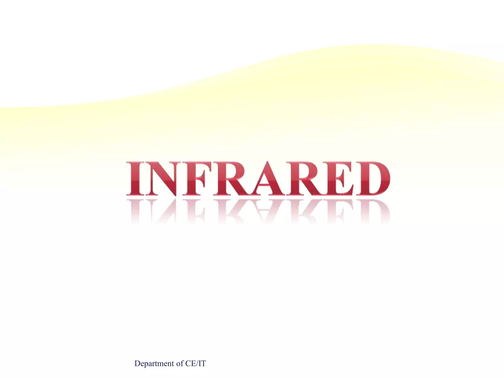 Infrared radiation is electromagnetic radiation with wavelengths longer than those of visible light, ranging from 700 nanometers to 1 millimeter. It is emitted or absorbed by molecules as they change their rotational-vibrational movements. Infrared radiation is used for a variety of applications including night vision, thermography, spectroscopy, telecommunications, and heating.