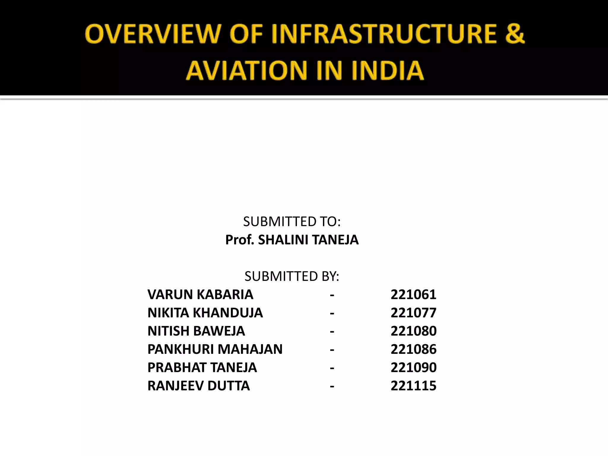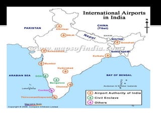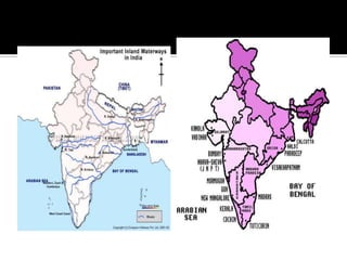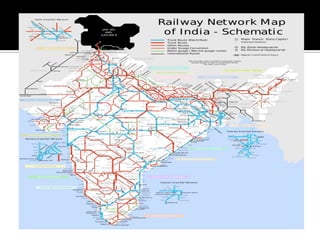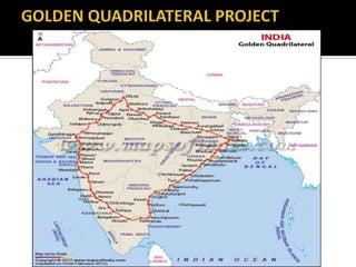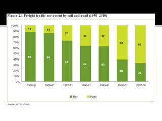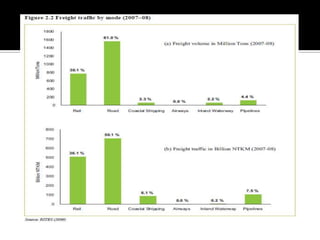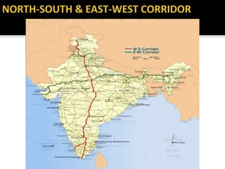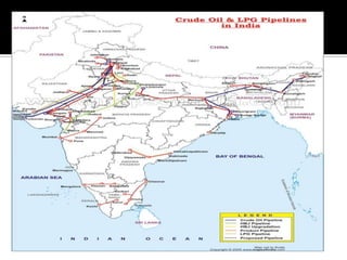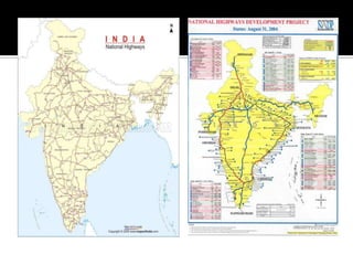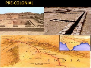 The document discusses India's infrastructure development over three periods - pre-colonial, British rule, and post-independence. It notes developments like the Indus Valley civilization, Emperor Sher Shah's infrastructure projects, and railroads introduced under British rule. Post-independence, the Planning Commission defined infrastructure to include transportation and telecommunications sectors. The document then provides details on developments in various infrastructure sectors like roads, railroads, civil aviation, ports, and energy pipelines in India.