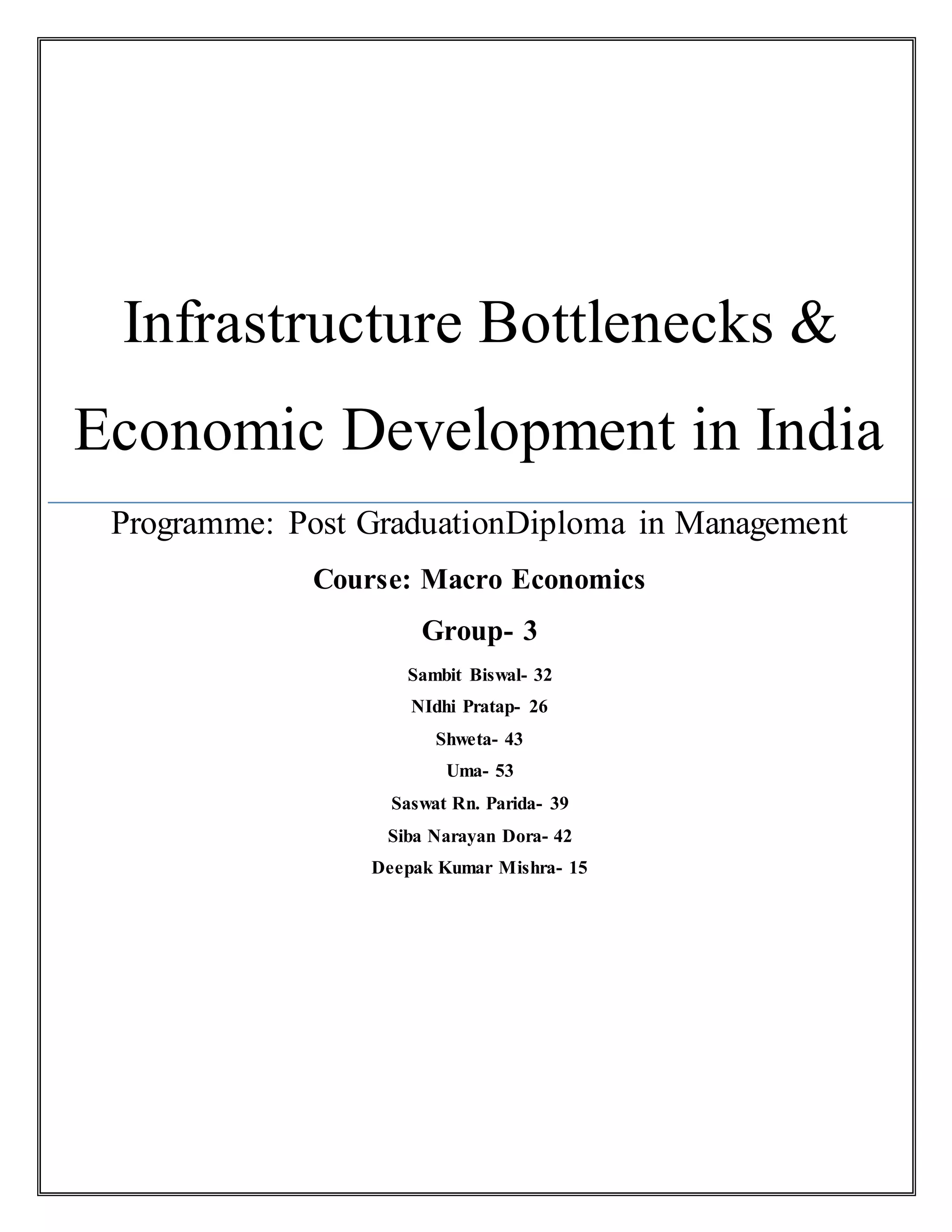 India's inadequate infrastructure is hindering its goal of achieving 9-9.5% annual economic growth. While the government has increased infrastructure spending, reforms have been slow and a lack of long-term funding options constrains growth. Key issues include delays from securing land and environmental clearances, as well as a lack of private sector participation. Faster infrastructure development is critical to support India's growing economy and meet increased demand from urbanization.